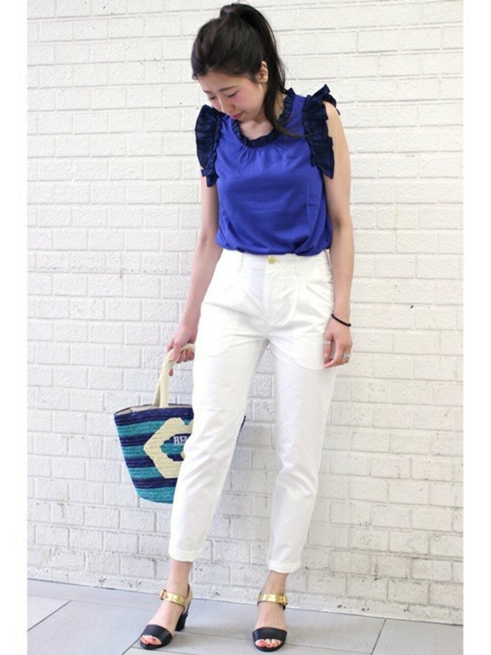 ブルー×ホワイトが爽やかなコーディネート。 キャッチ-さが人気のカゴバッグを合わせて スタイリングにアクセントをプラス★