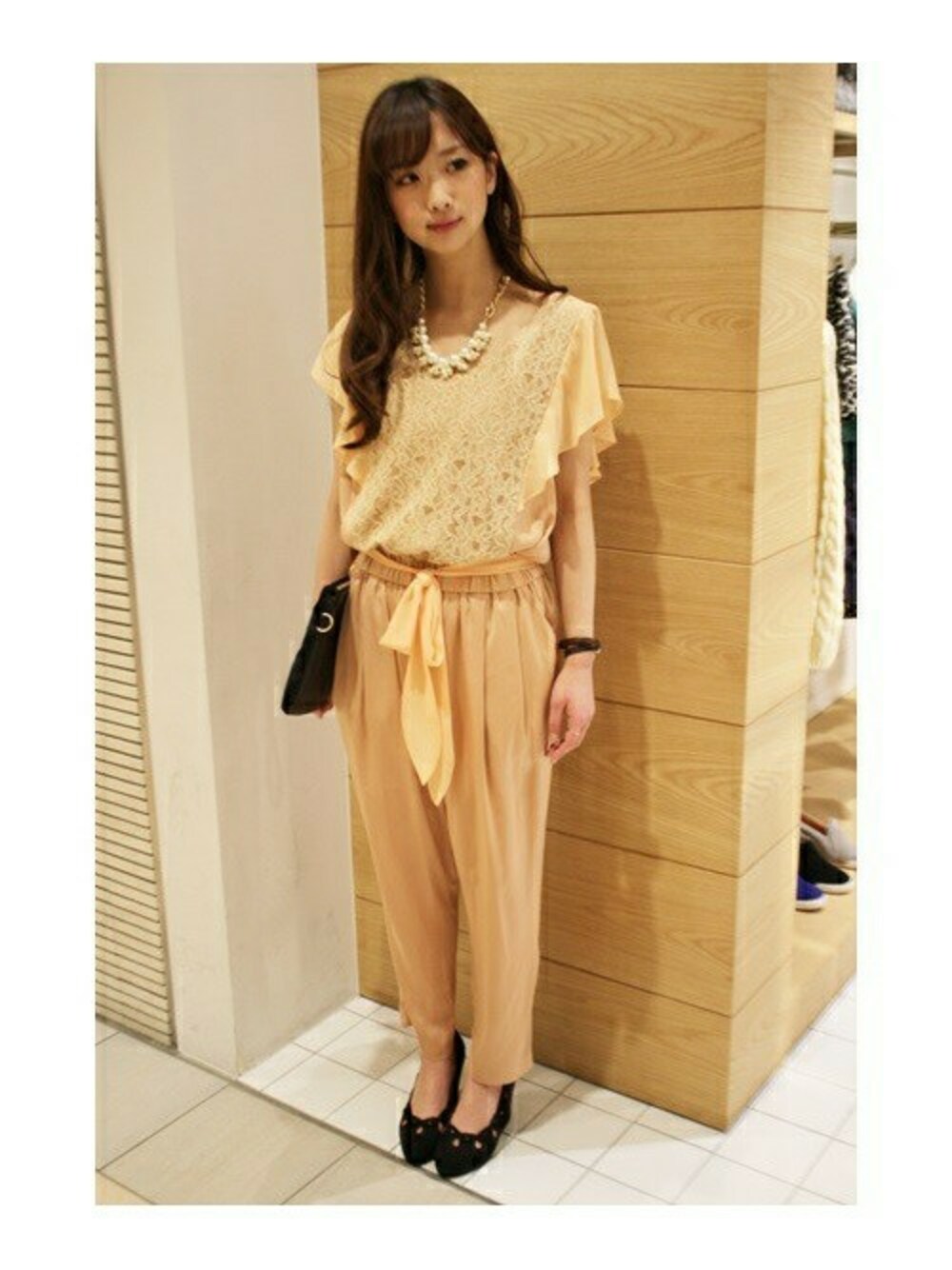 さらりと一枚着でサマになるオールインワンは、 今季も大注目のトレンドアイテム。トップス部分は レースとフリルで仕上げて女の子らしさをプラスしました。 エレガントな印象をアピールする光沢のある素材で 普段使いからオケージョンまで幅広く活躍してくれそうなオールインワンです。