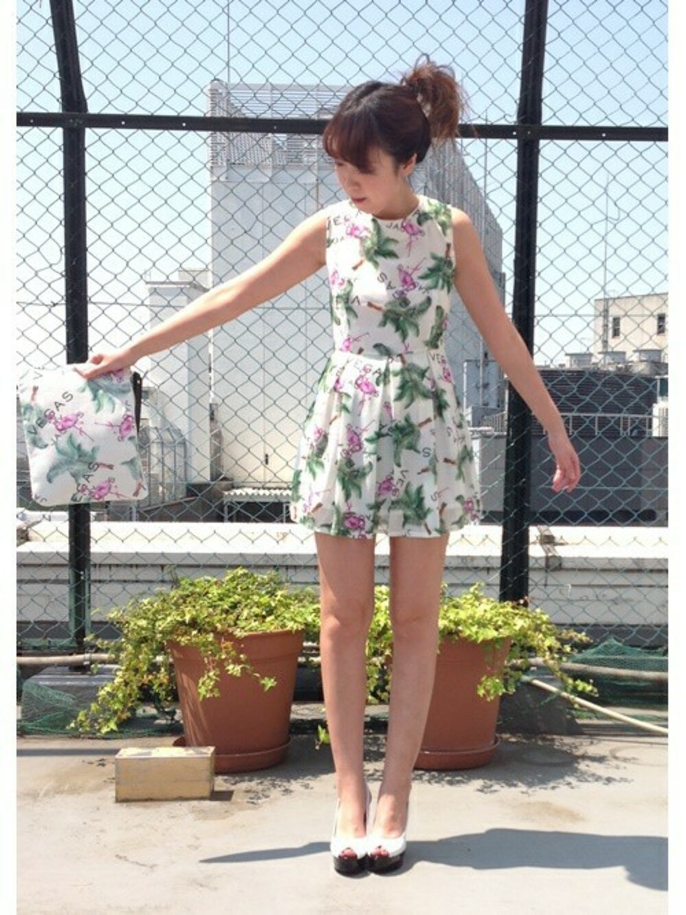 フラミンゴプリントがキャッチーなワンピース♪ トレンドのヤシ柄も合わせて、 とことん今年らしいルックスで周りと差のついた着こなしを叶えます★