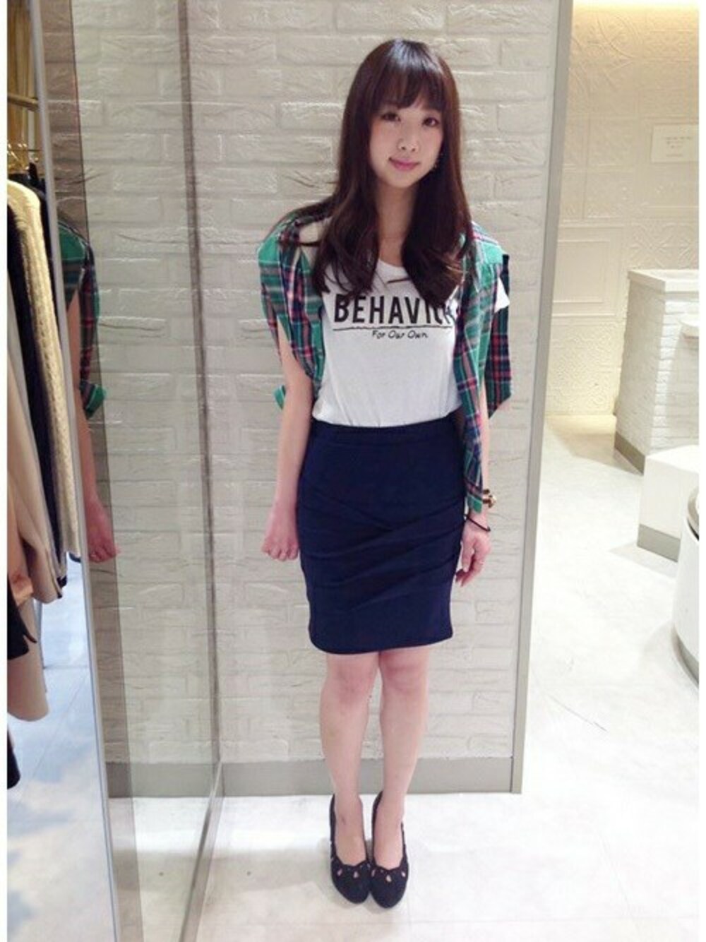 今シーズンも押さえておきたいロゴTシャツ。 定番のタイトスカートを合わせて女性らしさをプラスしました。 あえて肩にかけたチェックシャツがポイントになって◎