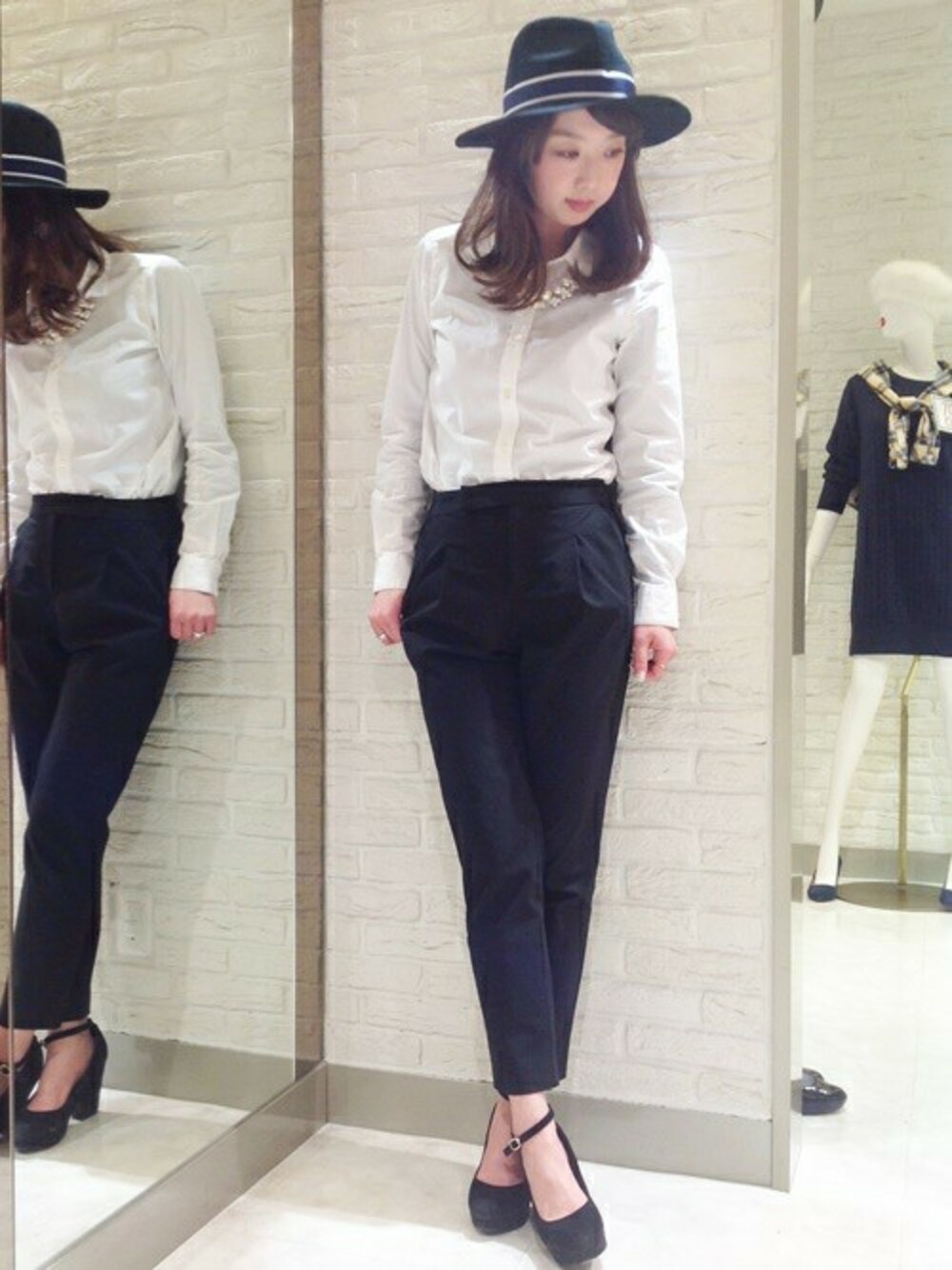 スタンダードな白シャツに、トレンド感のあるタックパンツを合わせてシンプルだけど見劣りしない大人コーディネート。hatはネイビーベースにホワイトのラインで春らしさUP。どのアイテムも着回し力抜群です。