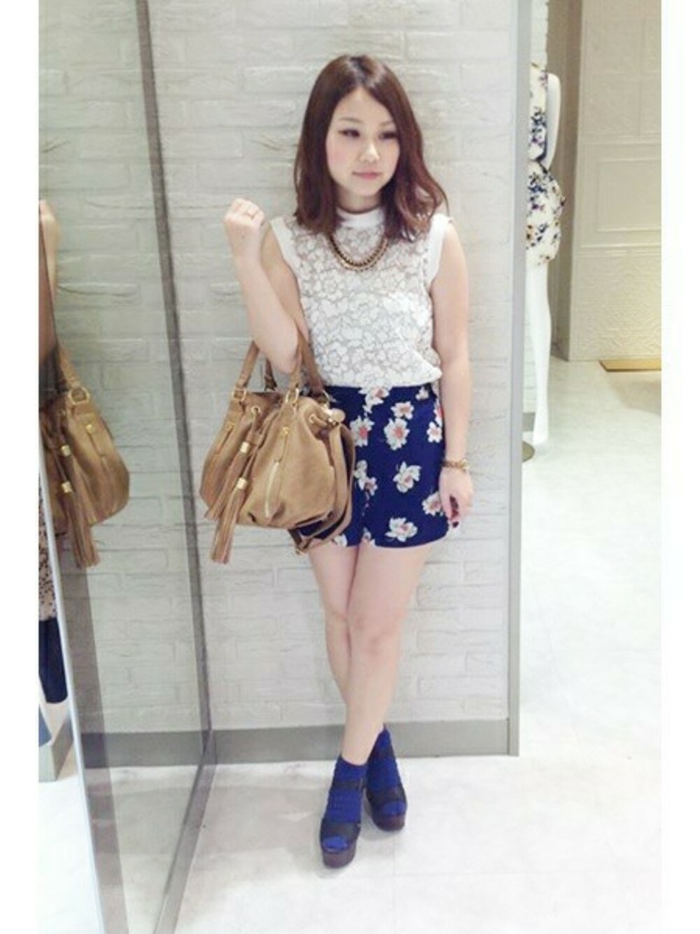 フラワーオンフラワーの オシャレ上級者コーデ♪ レトロ感のあるショートパンツは ネイビーを選んで大人かわいい 印象に仕上げました☆