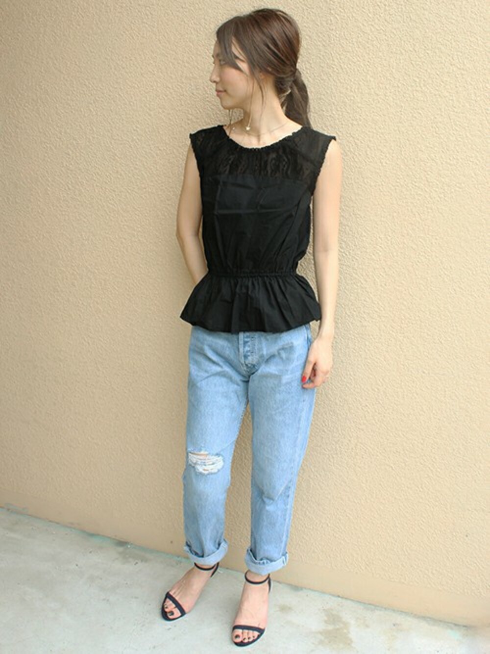 ウエスト部分がきゅっと絞られているので、脚長効果もある1枚です。 シンプルにデニムでさらりとスタイリングするのが◎