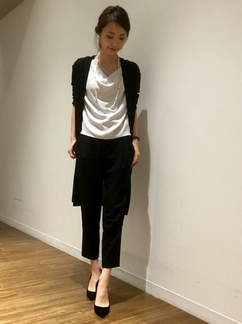 たっぷりとしたドレープが最大の魅力のブラウスは、それだけでスタイリングが華やかで王道のブラウス×パンツのスタイリングが格上げされた品のある雰囲気になります。