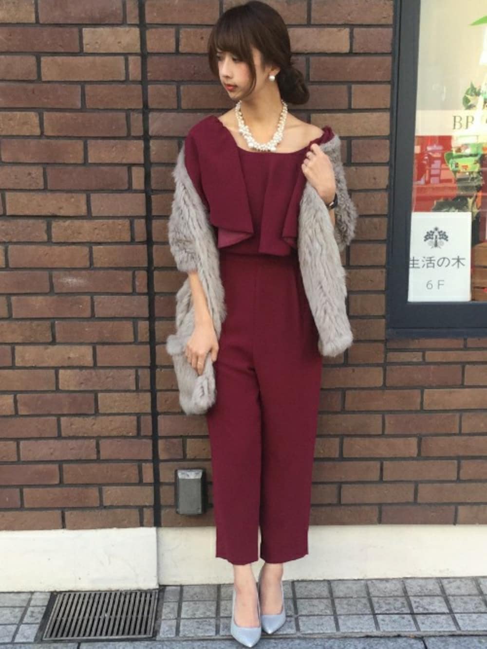 パールの合わせがエレガントなキレイめスタイル。結婚式やパーティーシーンで大活躍するスタイリングです。
