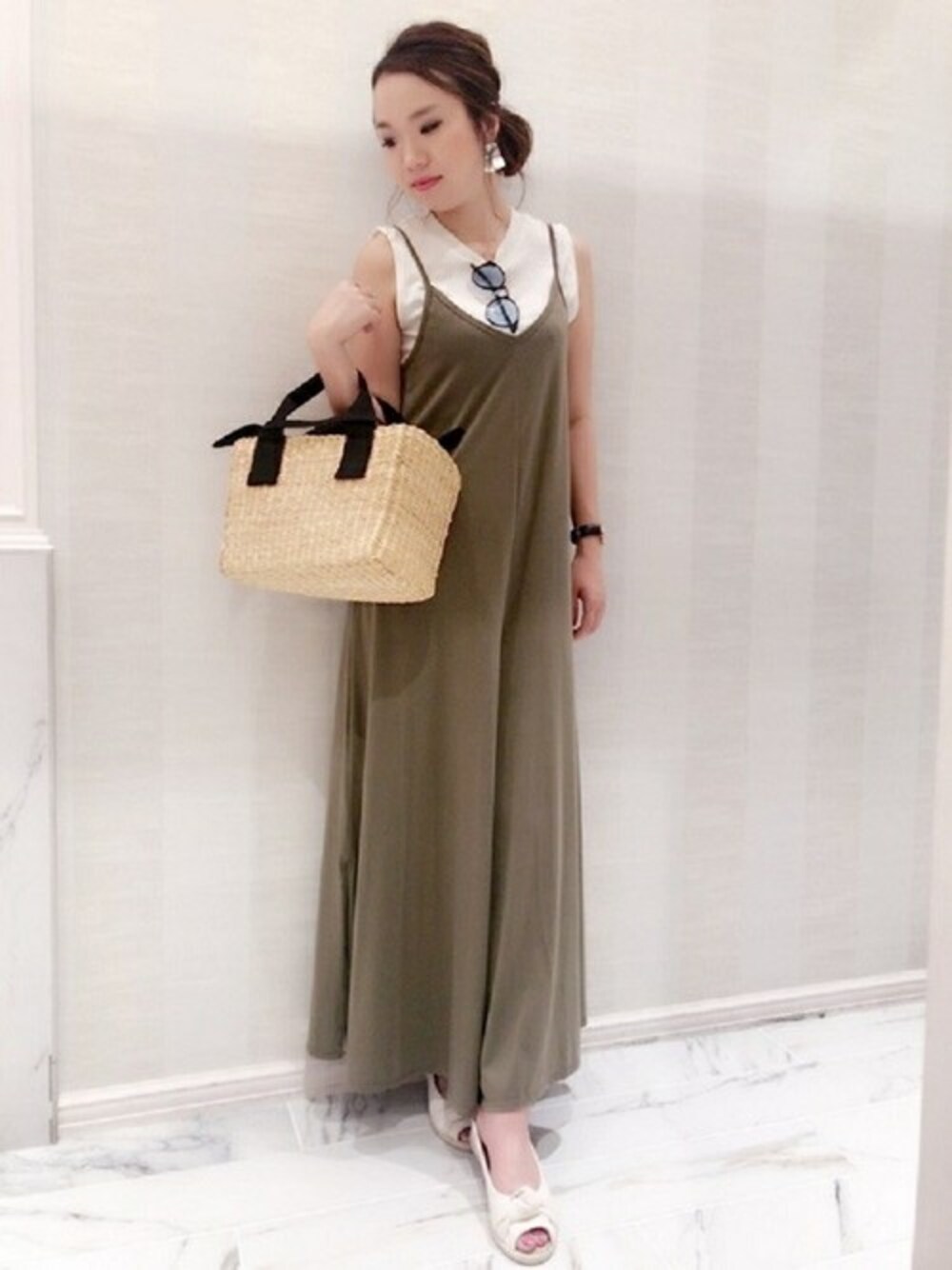 コットン50%とレーヨン50%のカットソー素材は着心地も柔らかく、吸水性にも優れているので夏のデイリー使いにピッタリです!手洗いできるのも嬉しいですね。 さらに腰から広がるワイドパンツは脚長効果抜群◎ 裾にはサイドスリットが入っていて、動いた時にちらっと覗く素足が夏らしさを演出。 キャミソール部分はアジャスター付きで調節可能。 1枚はもちろんスタッフのようにレイヤードスタイルでも◎ 身長165cmでアジャスターを少し長めにして着用した際に足首が見えるくらいの長さです。