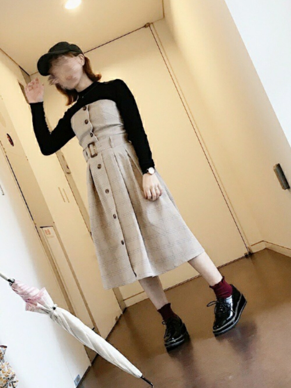 夏にレースのノースリーブと合わせてたベアワンピは、秋冬もニット合わせで使い回し😊 キャップとウエストバッグでカジュアルダウンさせるのが最近お気に入りです