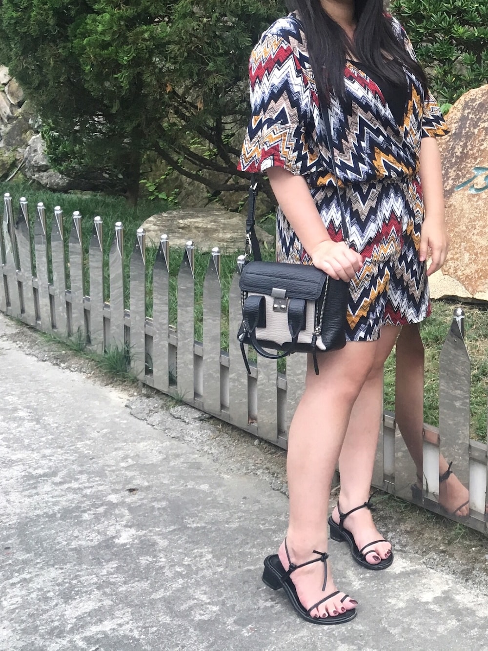 #夏日藏肉大作戰 擁有魔力的連身褲 自從被媽說穿這件比較瘦 害我很想包色😂 XL體型也能套進去~ 3.1熊貓黑白配色包 真的超級百搭 幾何圖騰的連身褲跟黑白包很搭✌️ 簡單綁結涼鞋也真的超好搭 絕對ok😍