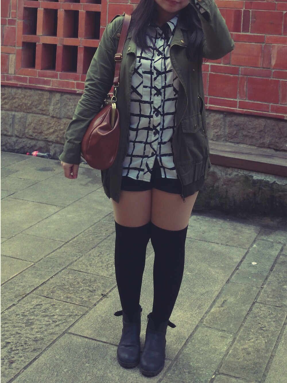 Color:黑,白,軍綠三色階 Coat:軍綠外套很帥氣的中性感 Top:不規則類格子線條的襯衫是ORENDA的獨家設計款,簡單但獨特。 Pants:黑色小短褲是百搭的好單品,不管上衣是誰都可以是他的搭配好夥伴。 Socks:過膝襪可以拉長腿的比例,視覺腿長瞬間+3cm。 Shoes:黑色靴子x黑色過膝襪,感覺腿變長長長長長長長。