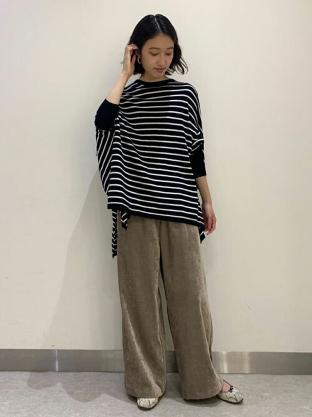 【tops】着用サイズ:F 前後で着用できるカーディガンをトップスとして着てみました。 サイドに深めのスリットが入っているので、ワイドパンツとも相性抜群です。 伸縮性:あり 透け感:なし 裏地 :なし 光沢感:なし 【bottom】着用サイズ:F ウエストリブシリーズにベロア素材が登場。 薄手のベロア地なので、秋口から着て頂けます。 伸縮性:なし 透け感:なし 裏地 :なし 光沢感:なし