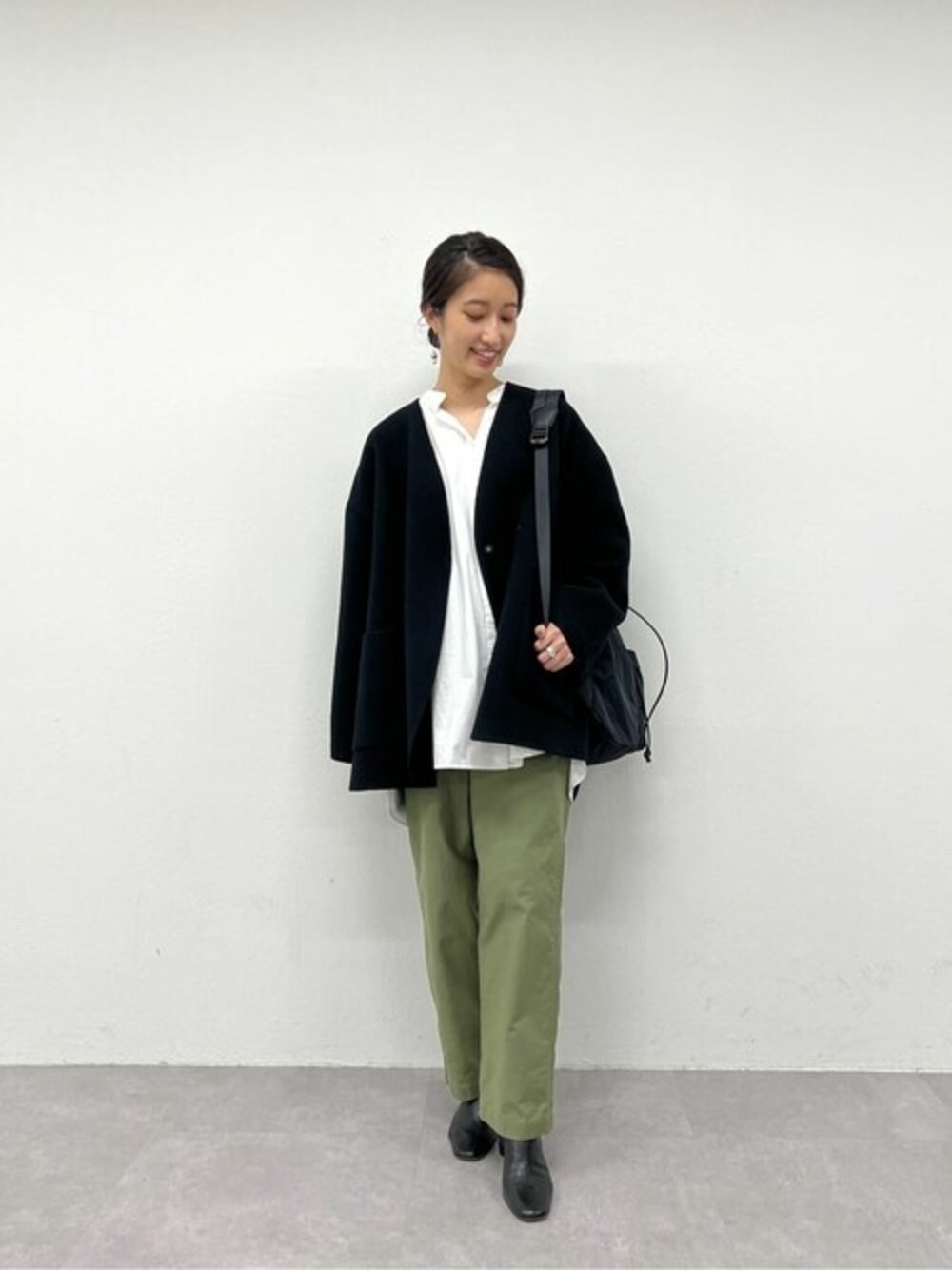 rinonのノーカラーコート「ショートリバーコート」を使ったコーディネート