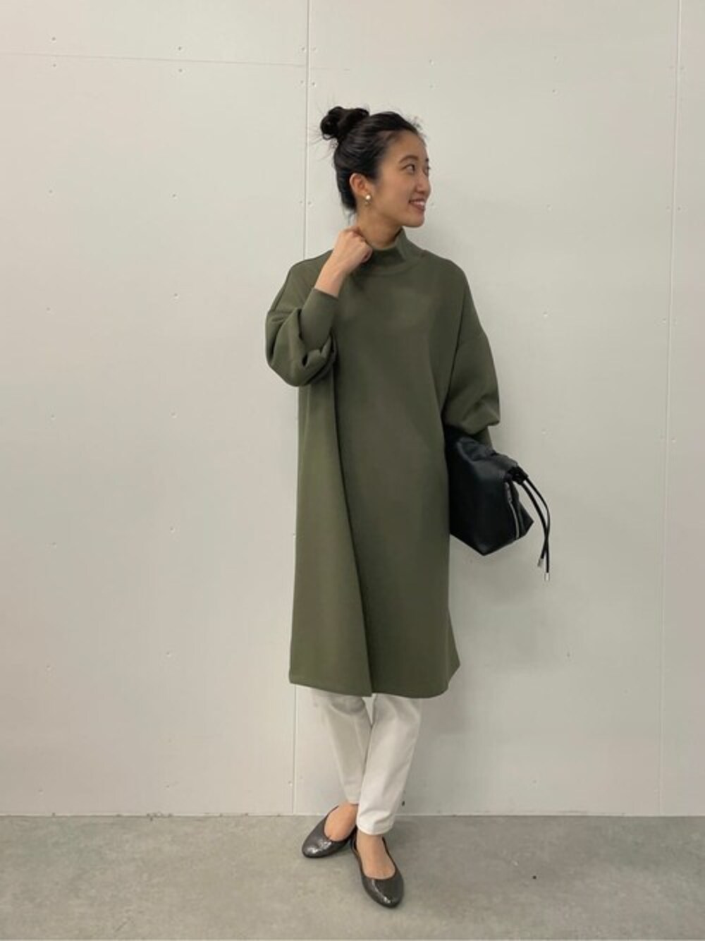 【one-piece】着用サイズ:F ダンボール素材のワンピースなので、シワを気にせずに着ていただけます。 165cmで膝丈になります。 【pants】着用サイズ:0 ストレッチの効いた細身のパンツで、ワンピースの下にレギンス感覚で着ていただけます。 【sample】shoes,bag,bangle,pierce