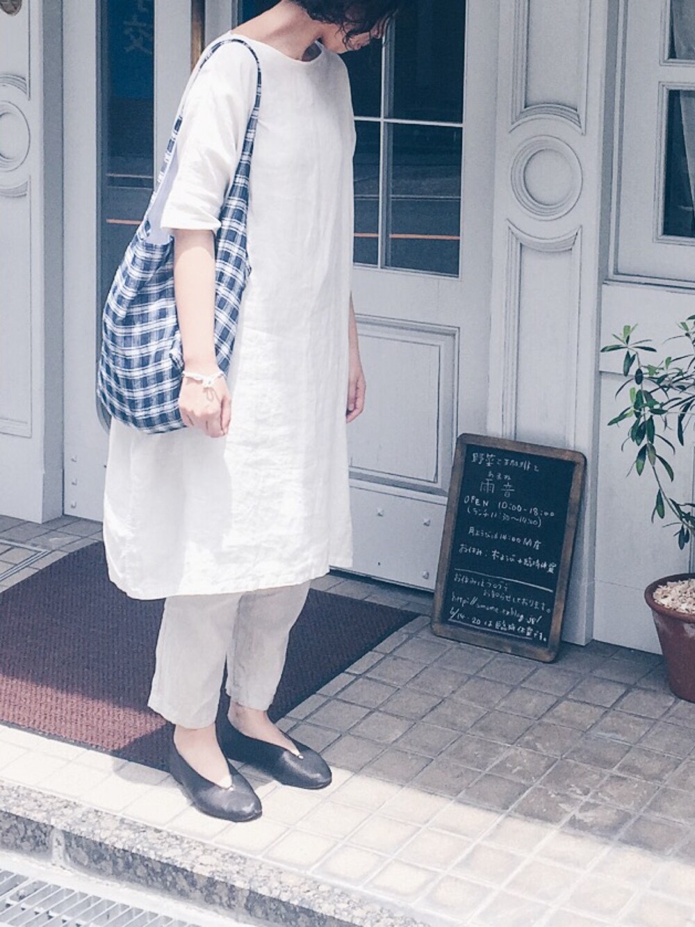 ブラック系のシューズを着用したレディースの夏コーディネートの1枚目の写真
