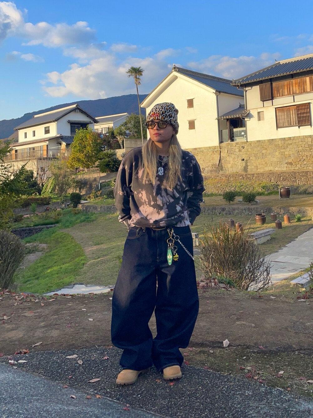GUの無地スウェットをブリーチで染めてアレンジしました💫 ヒョウ柄のニット帽に合わせて👍🏻