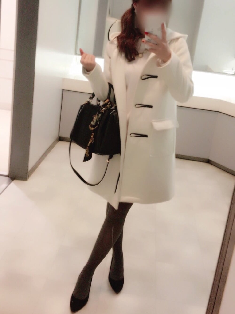 オールホワイトコーデ❄︎ 昨日は食べ飲み放題の飲み会だったのでたくさん食べても苦しくならないようにニットワンピ 笑 ダッフルは今年ファー無しでの白のロングダッフルを探し歩いてたところをLOWRYS FARMでディスプレイされてるのを発見して即決。 ファー無しっていうのが意外に難しいポイントでなかなか見つからなくて今年は苦労しました…笑 タイツはアッシュグレーです。 グレーのタイツに黒のパンプスがレディな印象に仕上がってこの冬のお気に入りです💓