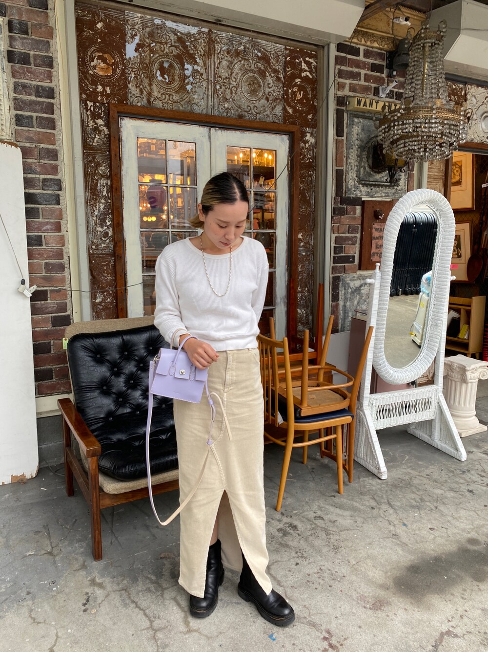 コーデュロイのスカートを綺麗に履きたくて♡ スリット入りなので大人っぽく着れるからお気に入り💜ベージュとパープルって可愛い💜💜