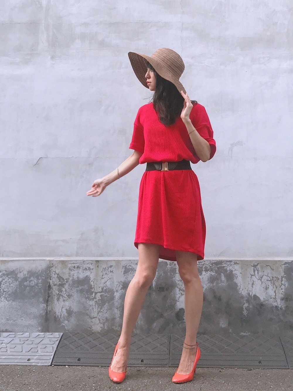 What I Wore: レッドが眩い金曜日のお出かけスタイルです☺︎ ワイドブリムハットでいかにもなサマー気分です❤︎ シンプルなラインネックレスをネックラインに合わせました★