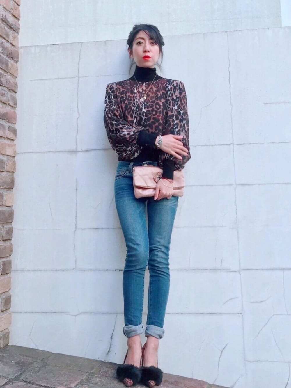 What I Wore: レオパードのシフォンブラウス×ローライズスキニーの大人カジュアルです☺︎ クラッチとレオパードパンプスでminimalにまとめました♡ 大ぶりな満月風イニシャル刻印入りチャームを長めのチェーン合わせています★ アクセントに少し太めのバングルもプラス♬