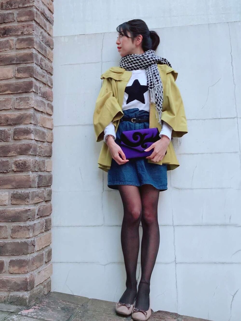 What I Wore: スタープリントのロングteeにデニムスカートというコンビネーションを大人っぽく仕上げるために マスタードイエローのアウターとブルーのクラッチバッグをプラスしています☺︎ teeに合わせてスターモチーフのピアスをサラっと合わせています★