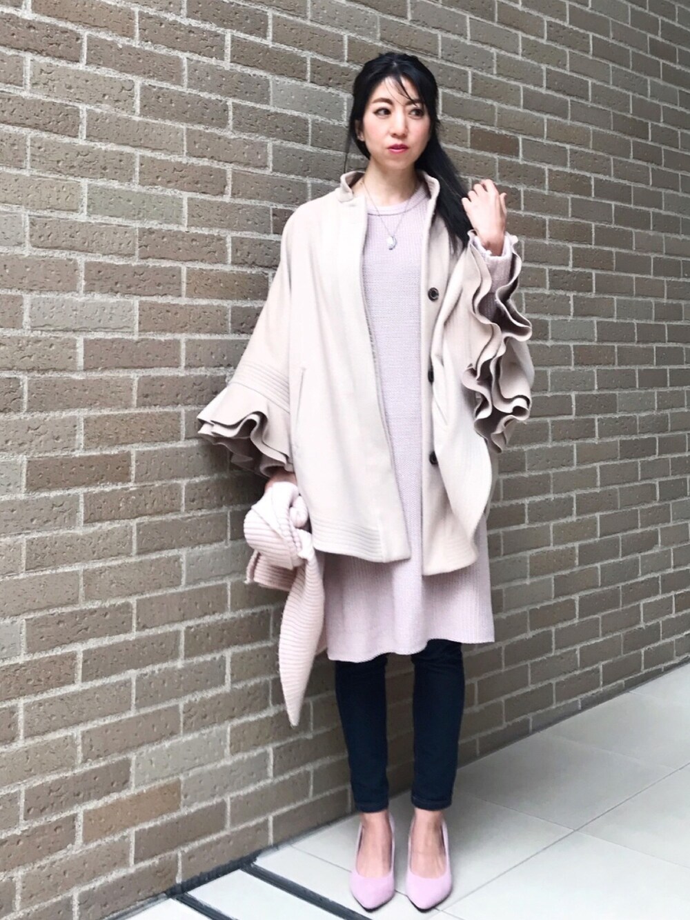 What I Wore: ベージュ系グラデーションの フェミニンスタイル☺︎ ピンク&ベージュは女性らしさと優しい雰囲気があって大好きなカラー❤️ ニットチュニックにラッフルスリーブのポンチョ風コートを羽織っています💕 ジュエリーだけ少しゴツいジェンダーフリーのフェザーネックレスの新作(未入荷)を合わせてみました✨ クリスマスにお揃い着けができるネックレスに乞うご期待🌟🎄 ホワイトゴールドのダイヤモンドピアスもさらっと合わせています🐈