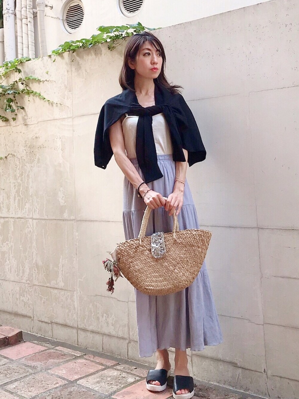 What I Wore: Costume Nationalのアイボリーのニットキャミ×プリーツスカート かごバッグでフェミニンに仕上げています🌺 スッキリな印象になる 0.1ctの一粒ダイヤモンドブレスレットを フィーチャーしています✨