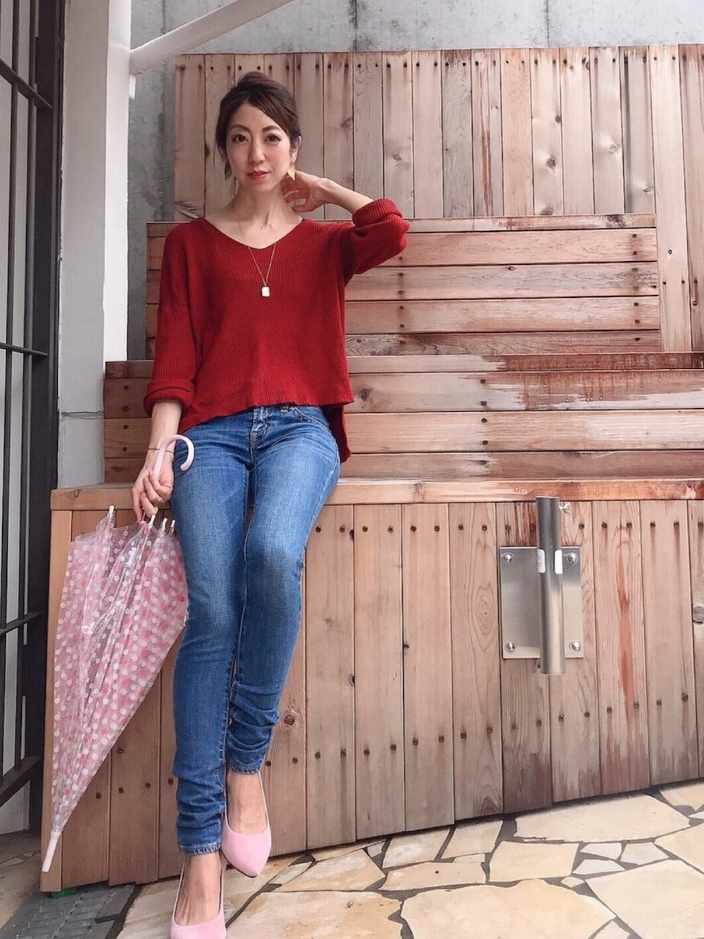 What I Wore: 早々に秋ニットを着た水曜日☁️☂️ ボルドー系レッドにベーシックなデニムで 至ってシンプルに仕上がりました☺︎ ダイヤモンドが主役として引き立つ ホワイトゴールドのトライアングル系デザインのネックレスとピアスを合わせています✨