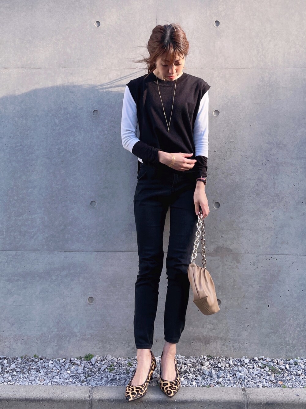 日中が温かい日のモノトーンの 大人カジュアルパンツスタイルにて アクセントに75cmのゴールドロングネックレスとシリンダーペンダントトップで縦長シルエットを描いています✨ 靴はfitfitのレオパードが程よい味つけに❤︎