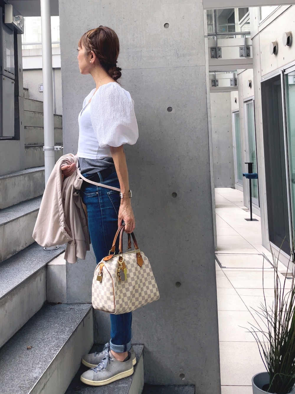 まだまだ蒸し暑い日があったのでこの日は ZARAのホワイトのボリュームスリーブteeのデニムスタイルです☺︎ 小物はベージュとグレーでまとめました🌱 手元はスマイルリングとハートリングでポジティブな感じのモチーフで揃えました❣️😃