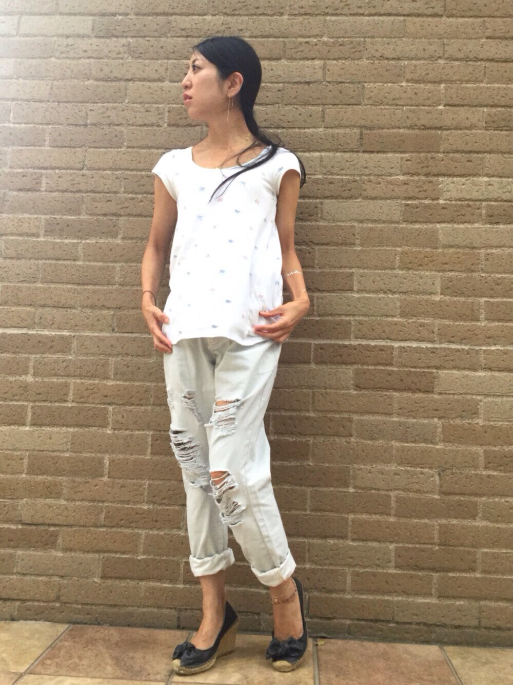 Today's Style: Titivateのゆったりシルエットのダメージデニムが大き過ぎて 実は短パンの上から履いています☺︎ Languageのリボン刺繍のカットソーを合わせています🎀 ジュートサンダルにもリボンが付いています♪ two plyのリボンネックレスでリボン尽くし❤︎ タトゥーシールはフローラル柄を慎重しました🌸