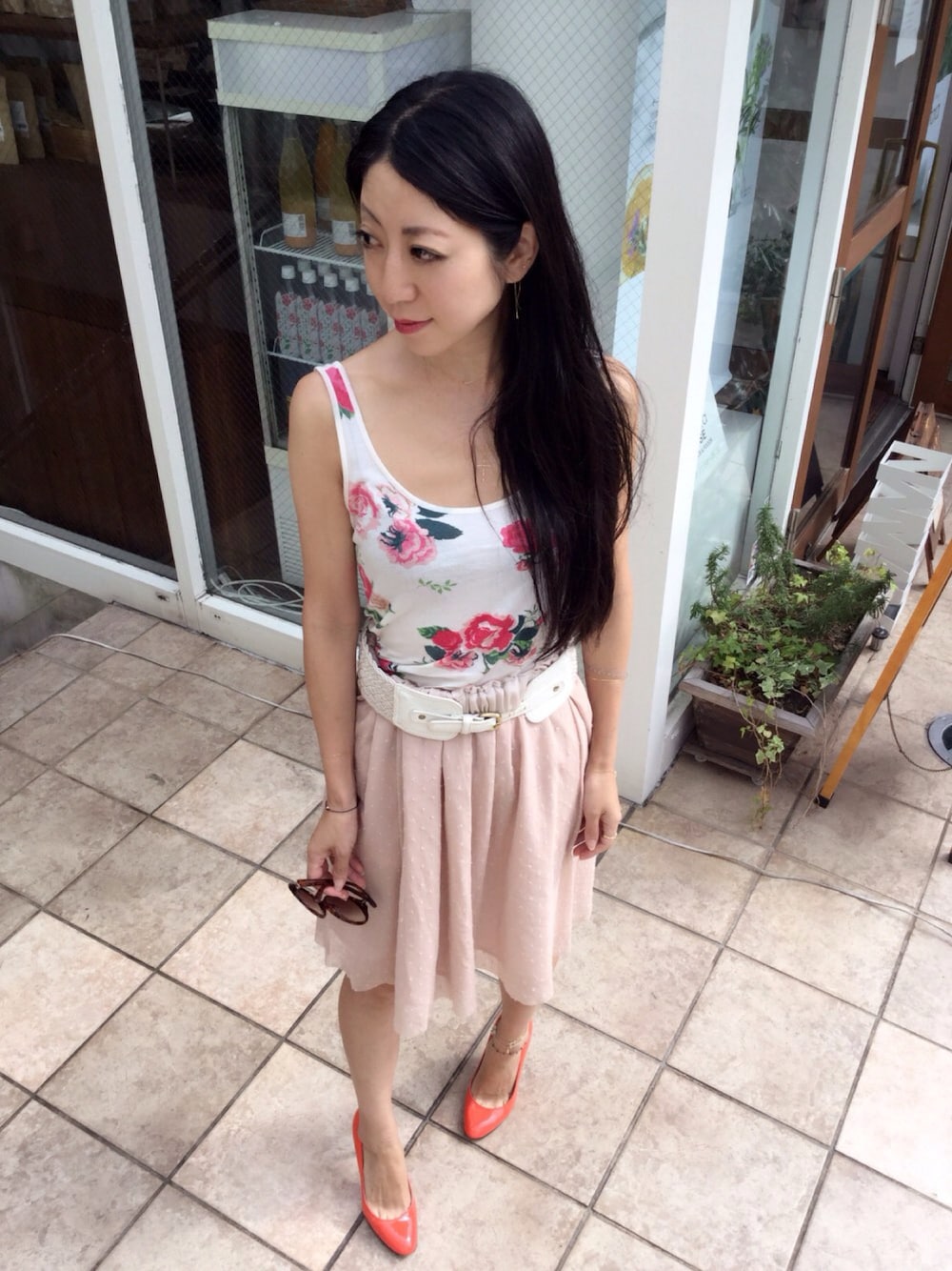 Today's Style: 連休中日で出勤の日曜日は H&Mのローズプリントのタンクトップ×ダブスタのドットシフォンスカート☺︎ サイズが緩いのを誤魔化すためと アクセントとして太めのホワイトのベルトをプラスしています☆ ネックレスは久々にpinacotecaの華奢クロスのチャームを50cmで着けています♪ 重ねているのは同じくpinacotecaの極小サイズの1粒ダイヤモンドネックレスです❇︎ クロスチャームネックレスに合わせてpinacotecaクロスモチーフのダイヤ入りブレスレットをプラス 1粒ダイヤモンドネックレスのダイヤに合わせてtwo plyのキャビアダイヤモンドピアスを合わせています✨✨✨