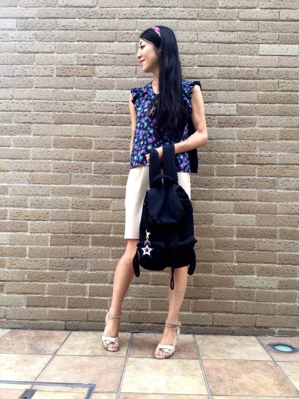 Today's Style: KIKKAのフローラルプリントのノースリーブブラウスとベージュのスカートです☺︎ SEE BY CHLOEのリュックを合わせています❤︎ ネックレスはフェミニンな印象でまとめたくリボンモチーフです♪ ヘアバンドで更に甘さをプラス✨ 目をつぶった写真ですがご愛嬌で!