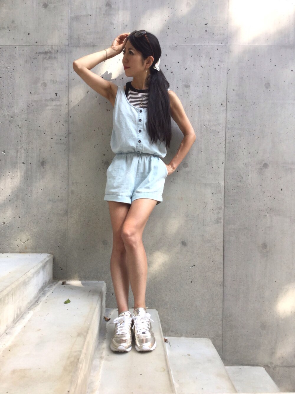 Today's Style: 久しぶりの夏日 36℃という暑さでしたね☺︎ シャンブレー風ロンパースにボーダーのミッドリフのタンクトップニットを合わせています♪ ボーダーに負けないles desseins de DIEUの大ぶりの六芒星チャームを60cmのネックレスで着けています✡️ 耳元もpinacotecaの大ぶりのキュービックジルコニアのピアスでアクセントに! 足元はREEBOK×Sandroのゴールドスニーカーで個性的な仕上げとなっています❤︎
