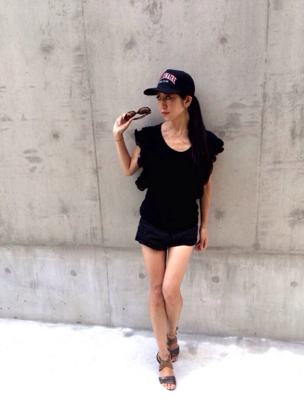 Today's Style: Sov.のフリルのトップスにドットのショートパンツを合わせています☺︎ Billionaire Boys Clubのスナップバックをいただいたので 早速かぶってみました♪ 28vingt-huit(メンズ)のシルバー×ゴールドのナンバーネックレスを着けています❤︎ そういえば Pharrell Williams (ファレルウィリアムス)とは数年前に麻布十番のバーで一緒にカラオケで歌いました☆