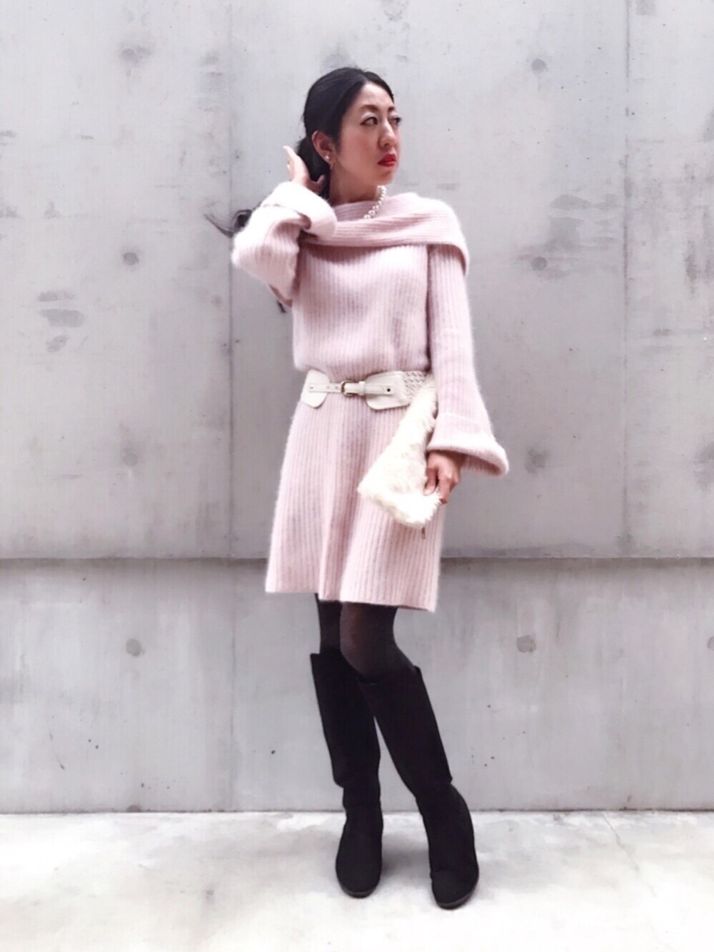 Today's Style: コートが要らない木曜日でした☺︎ 淡いピンクのアンゴラニットワンピースとロングブーツでフェミニンなきれいめコーデです🐰❤︎ フェイクパールのチョーカーネックレスとホワイトのサッシュベルトをポイントに ファークラッチもライトベージュ系でトーンを合わせました♩ 今日はtwo plyの新作トパーズブレスレットを着けています★
