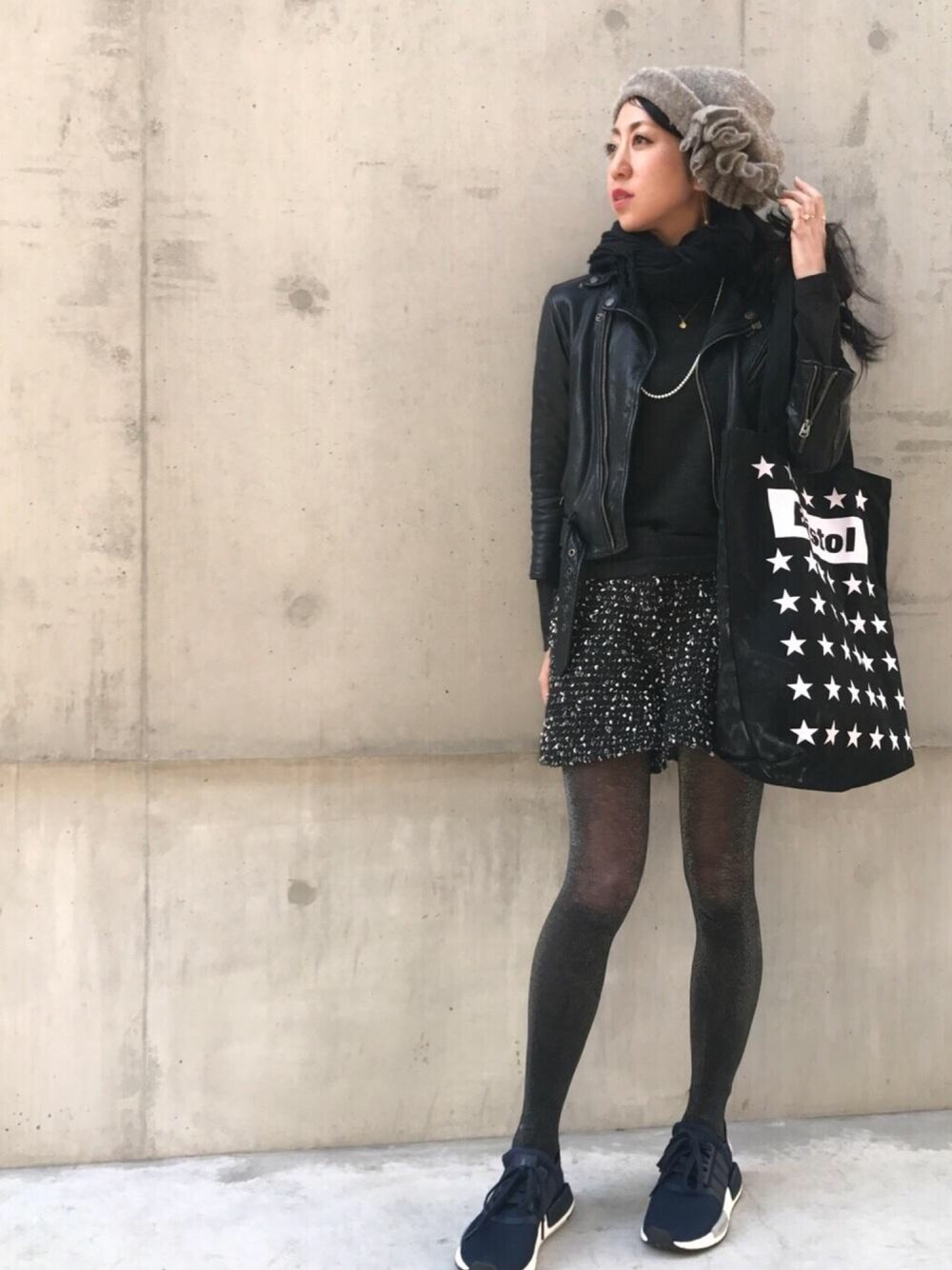 Today's Style: 冷え込んでいた木曜日はコートの下にライダース×ニット×ツィードショートパンツでした☺︎ 全体的にブラックでまとめています★ キャスケットで甘さをプラス❤︎ pinacoteca の新作リング2本も着けてみました♩
