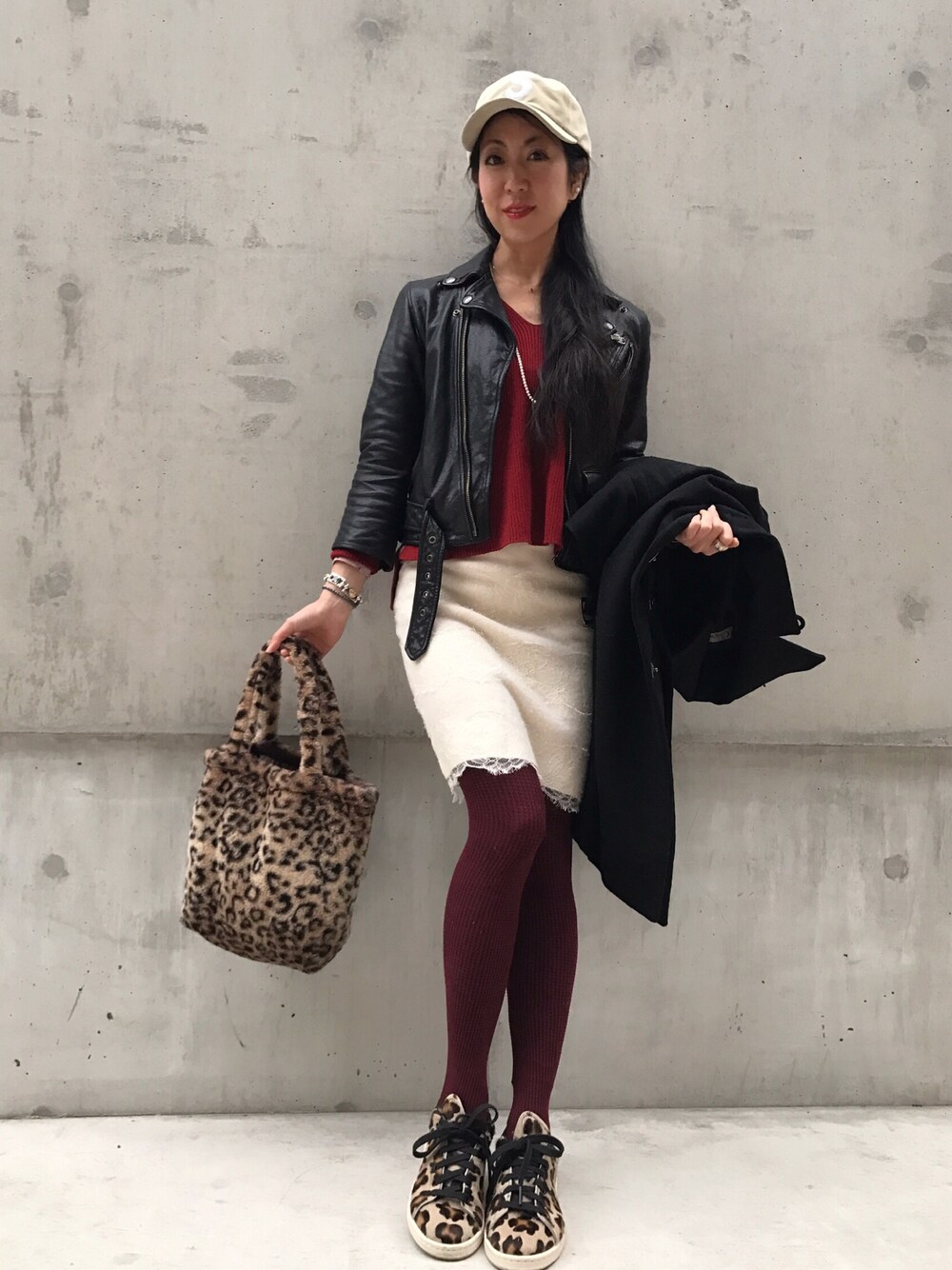 Today's Style: 雪が降ると言われた寒〜い金曜日☺︎ nico and...のボルドー系のVリブニット×Christian Diorのホワイトのウールスカート&ライダースJKでした❤︎ ニットに合わせたボルドーのタイツ シューズとバッグはレオパードでまとめました🐆 ボルドー系に合わせてtwo plyのネックレスもガーネットです♫