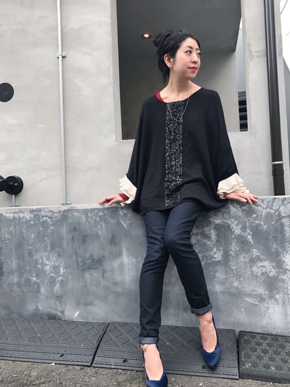 What I Wore: 帰りに何も予定のない金曜日の出勤スタイルです☺︎ フリルのディテールの付いたドルマンスリーブをスキニーに合わせています❤︎ 夜は寒かったのでこの上にコートを羽織りました★ ネックレスはハズしでウサギモチーフです🐰