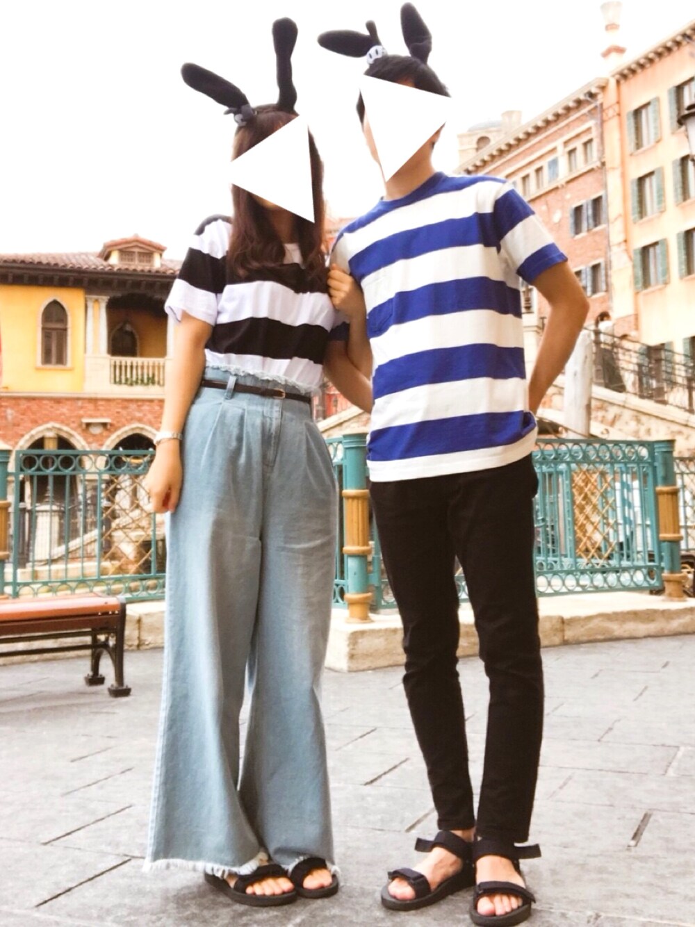 ボーダーのシミラールック💙🖤 上下で色が逆になるようにしました。 サンダルと耳はおそろいです!