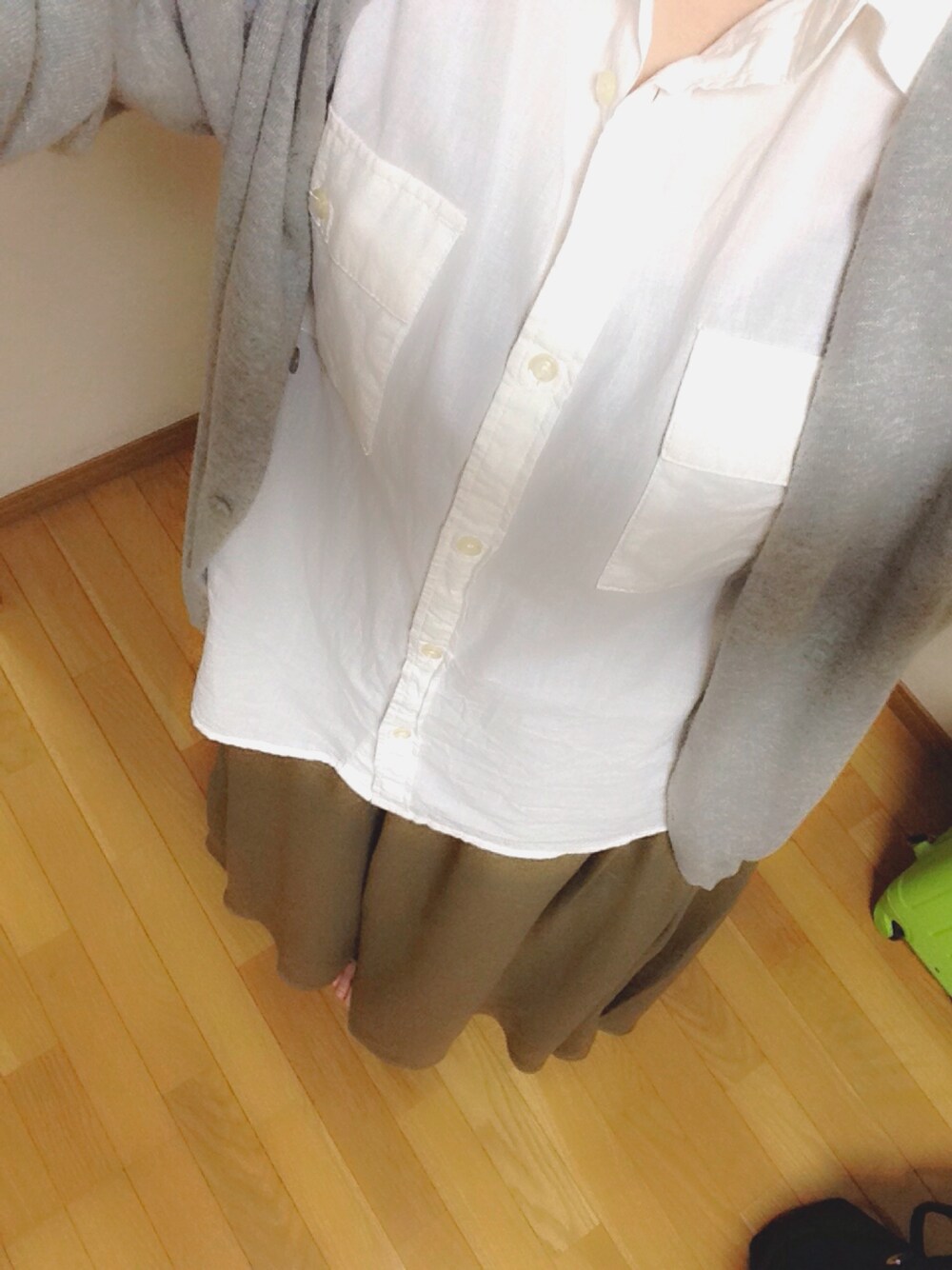 GUの新作スカートとお気に入りのノースリシャツを合わせました〜 寒いのでカーディガン必須です