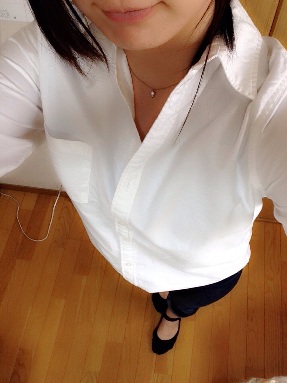 back numberの白シャツを買ったのでシンプルに! デニムは5年ほど履いてるユニクロのストレートジーンズです〜 足元は黒のパンプスで仕上げたいなぁ