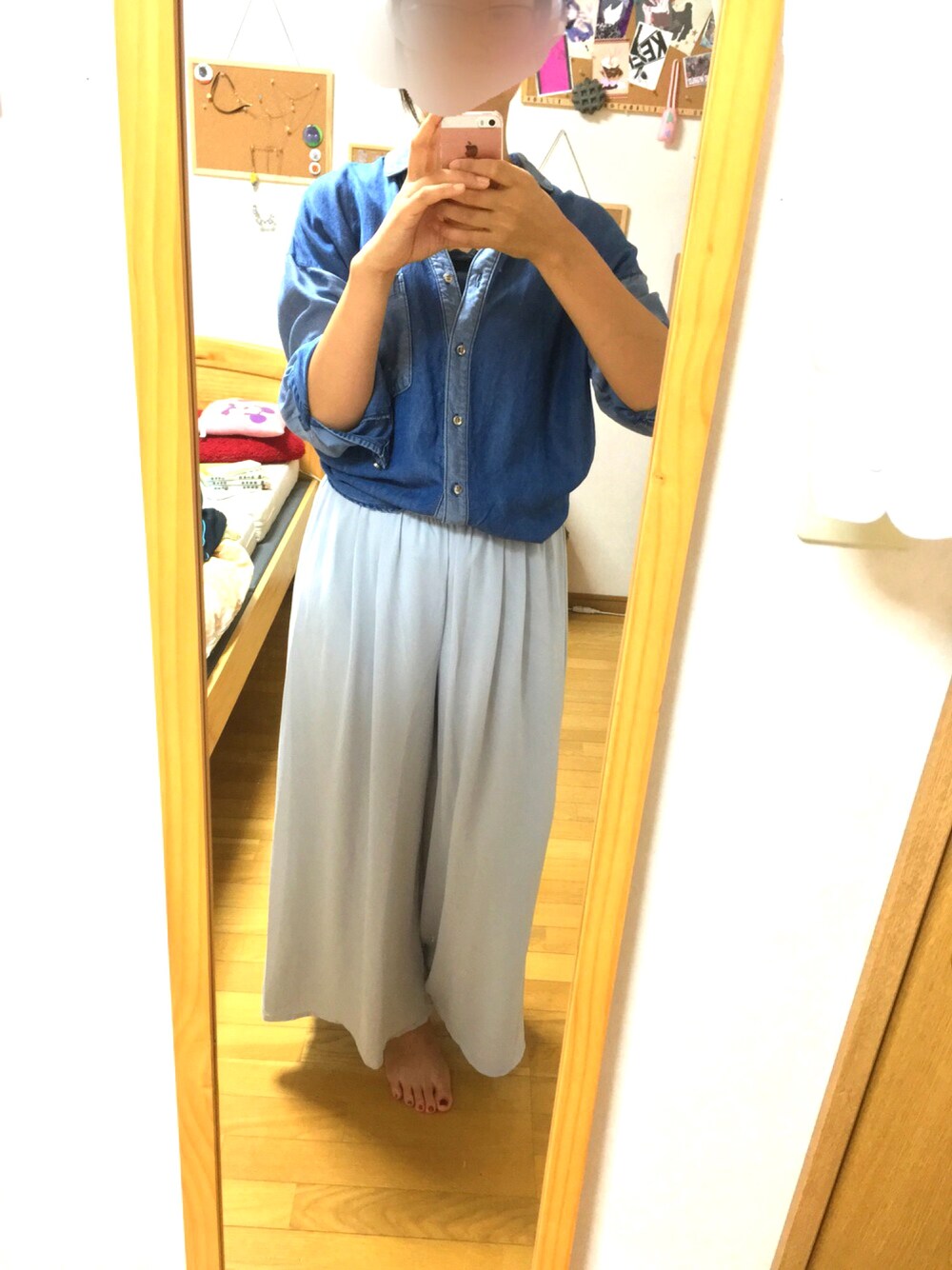 前に買ったセットアップからスカーチョを選んでみました。青みがかったライトグレーなのでデニムシャツと合わせてワントーンコーデ風にしてみました〜