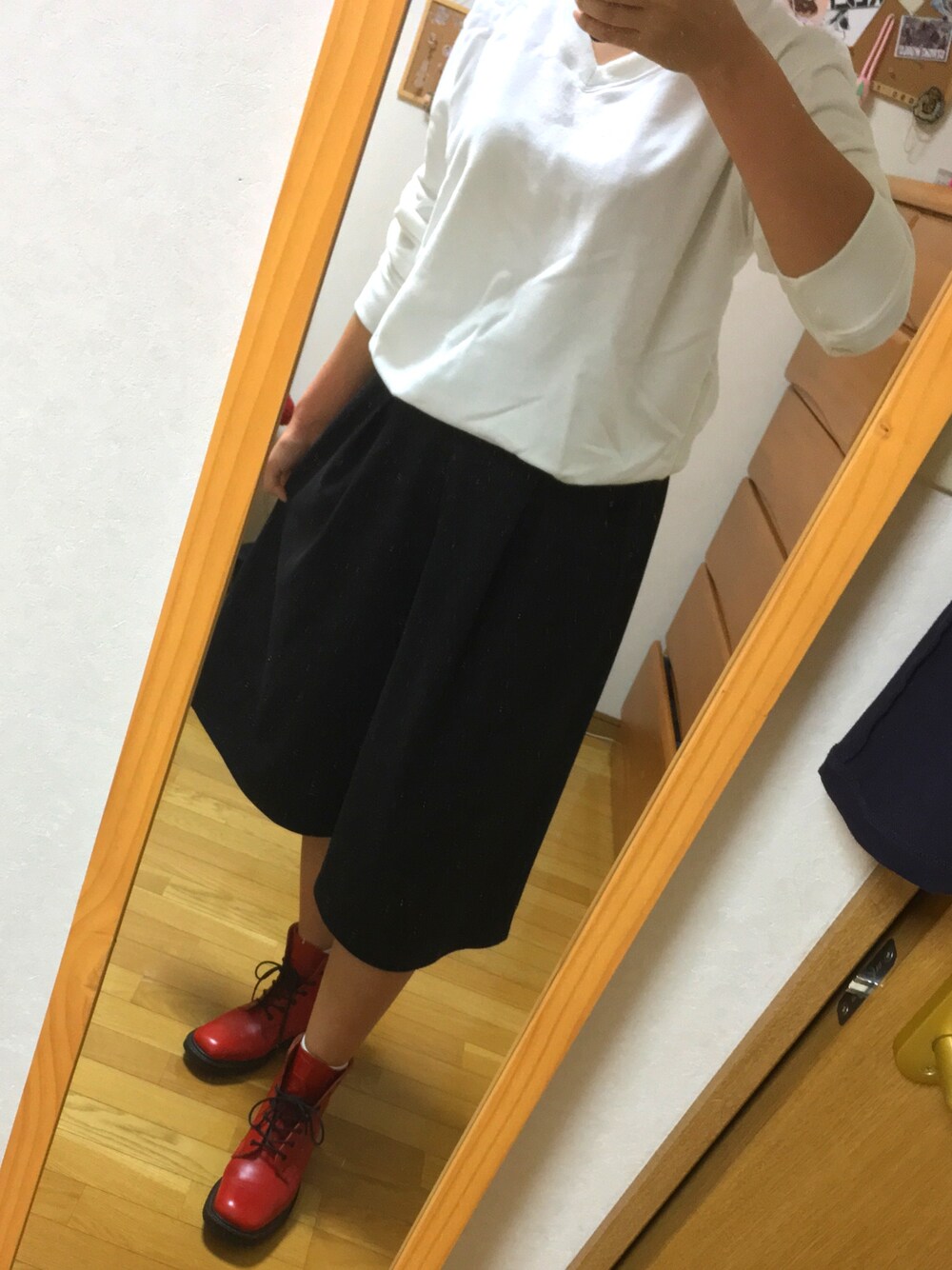 もらった赤のブーツ(ワーキングブーツってやつですかね?) を使ってみました! ブーツがごついので、他はシンプルに仕上げてます。GUのガウチョはオールシーズン使える優秀なやつです。