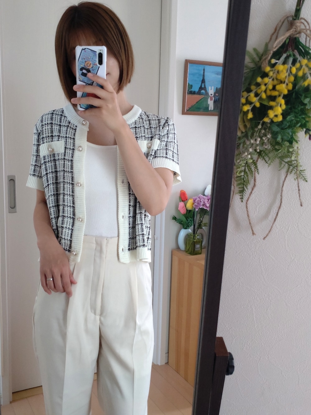 たくさんのコーディネートから見つけていただいてありがとうございます👏😍💕 半袖のツイードカーディガン💃 柔らかい生地で暑くなくて着やすい💕