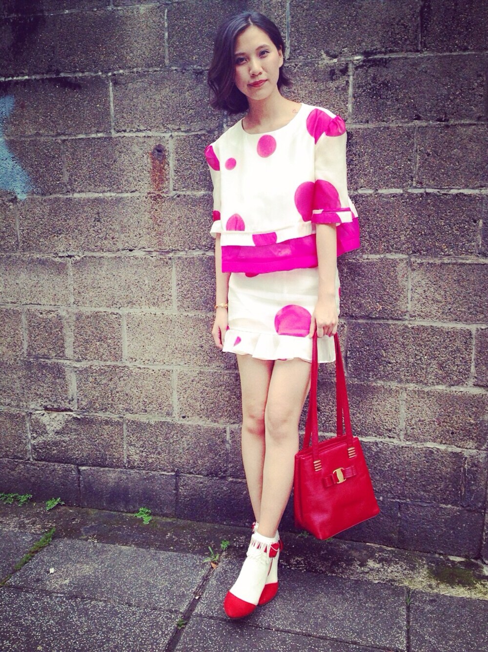 オレンジ系のパンプスを着用したレディースの夏コーディネートの1枚目の写真