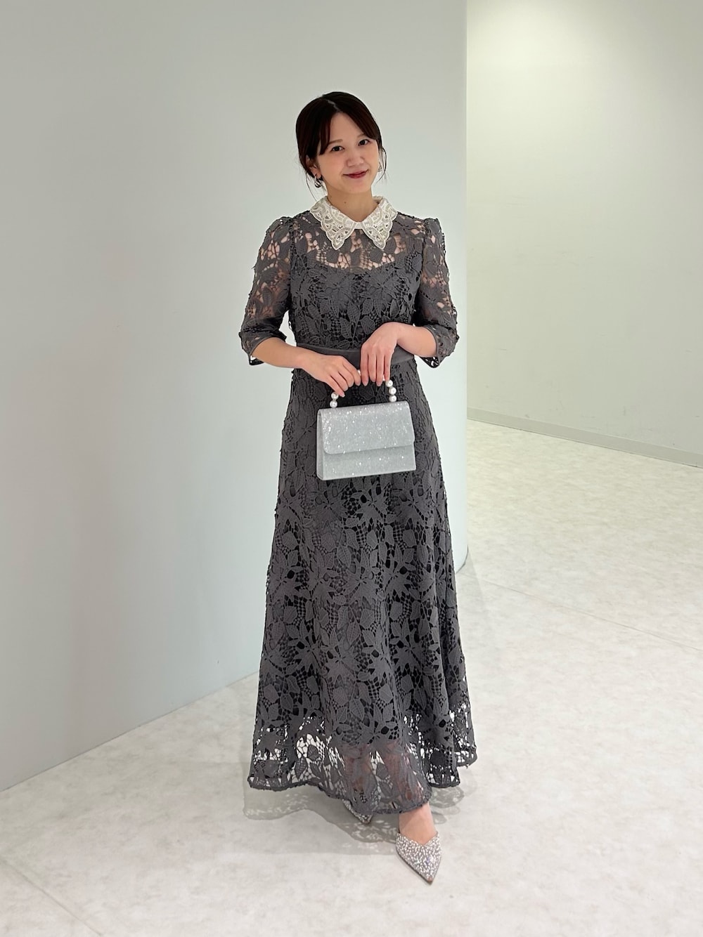優雅さと清楚さを兼ね備えたレースワンピース 全体にあしらわれた繊細なレースが上品な印象を与え、特別なシーンをより華やかに彩ります。 デザインのポイントは、スカラップレースの美しさを引き立てるフィット&フレアのシルエット。 ウエスト部分を程よく引き締めることで、スタイルアップ効果も期待できます。 クラシカルな印象のホワイトカラーの襟は、上品かつアクセントに。 袖は五分丈で、気になる腕周りもさりげなくカバー。スカート部分は裏地付きで、透けず安心して着用いただけます。
