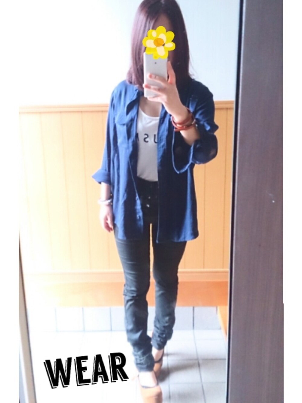 今日のコーデじゃないですけど、、 このネイビーのシャツ結構気に入ってます♪ ハイウエスト/g.u.