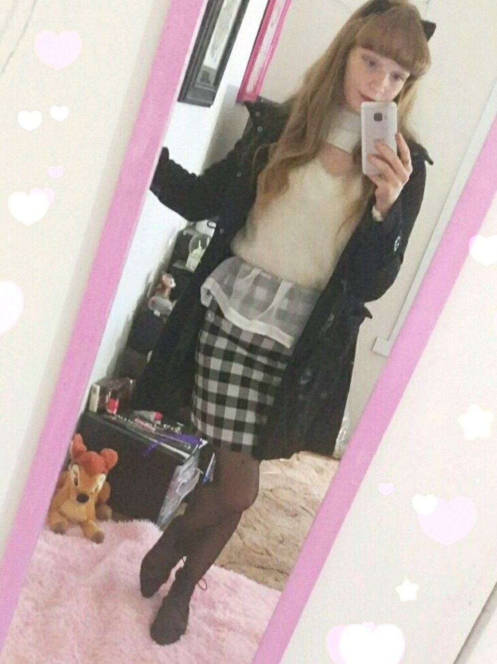 I was inspired by Risa Nakamura's high waisted pencil skirt I saw a few weeks ago in a street snap, so I decided to make my own version of the pencil skirt with a chiffon overlay. its becoming cold in Melbourne, so I decided to try LARME with the nice warm trench coat and fluffy sweater n.n paired with flats I bought off eBay and sewn pom poms to the ends.