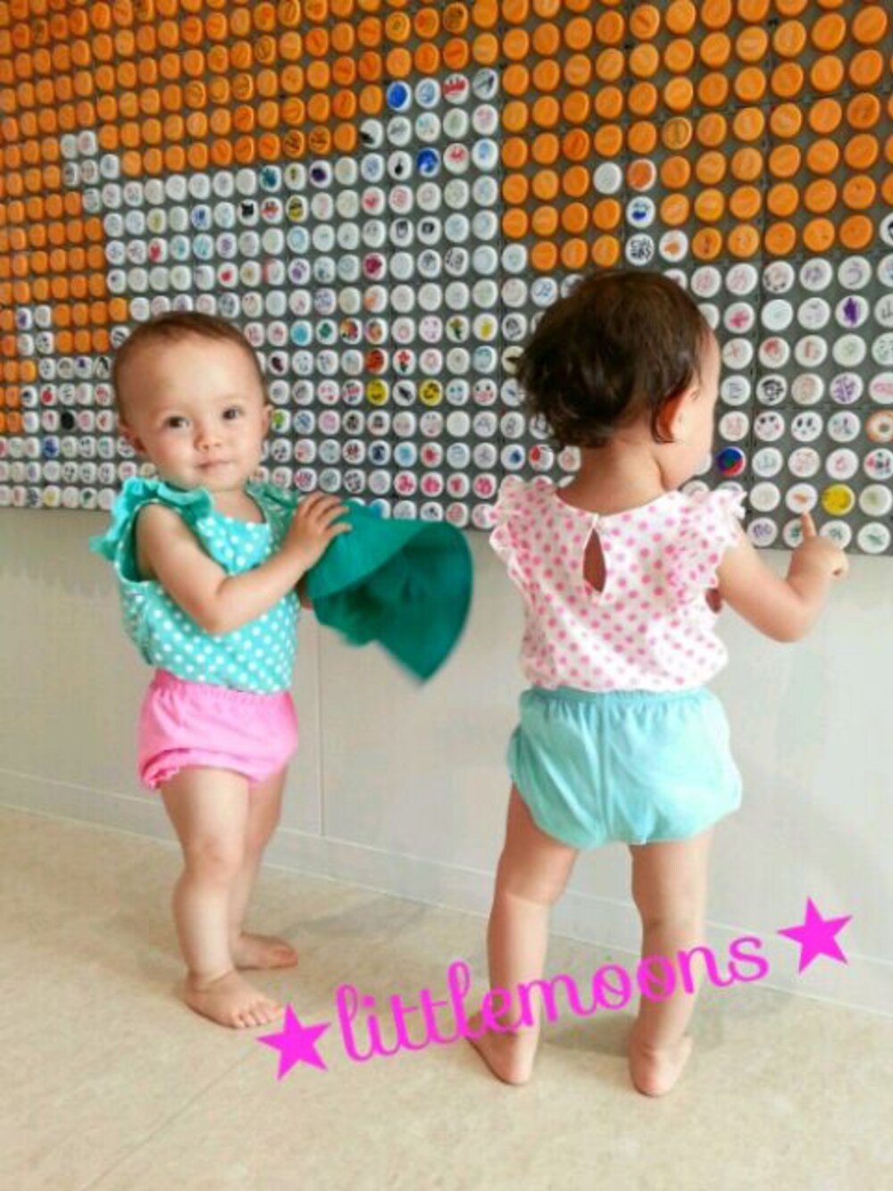蛍光ドットと、そでのフリルがポイント! 袖にボリュームがあるので、シャツをインして短めのパンツ(サイズ6mだけど、まだまだ履けます。そして、タイト目なのですっきりしてて好き ) で合わせました。 双子コーデで、ふたりとも上下、蛍光ピンク×ミントグリーン の色違いで揃えましたー。 こんな色の組合わせが好きでーす!