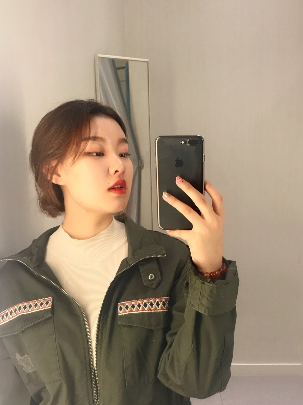 グリーン系のジャケット/アウター、レッド系の口紅/リップティント/グロスを着用したレディースの夏コーディネートの1枚目の写真