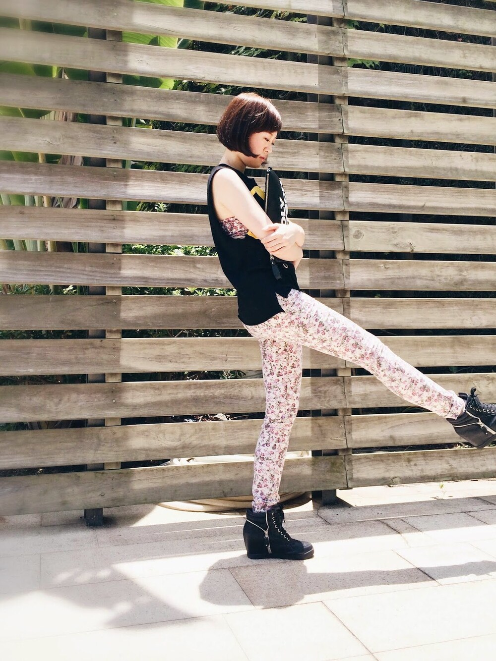 HI!!!! Super Floral here!!! Haha, this is a super hero inspired look. I love Batman and I love floral print so I create a combination of both of them. Yeah~ The Batman top I bought has long slits on the both sides connected with the arm holes which expose part the sides of your body.This kind of top is a good choice if you would like to expose your skin but you afraid to wear crop top that show your belly. Belly is a kind of place...you know xd. When you wear this kind of top, be careful to choose you undercover top. Try to hide your bra but if you like to show them, well, welcome JK. In this look, I choose a floral bandeau top to match with my floral trousers.
